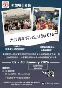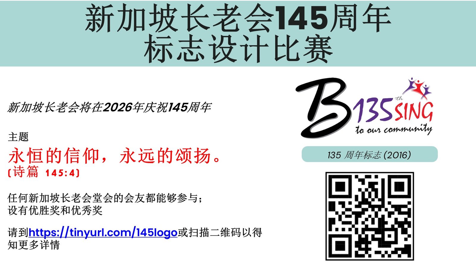 基督教新加坡长老会 新加坡长老会是基督教会的一部分。教会的宗旨是团结新加坡各长老会教会,以自治、自养、自我见证的精神,宣扬基督教教义,实行基督徒生活,并在地上扩展神的国度。 AGM 2025AGM2025 Installation CeremonySynod Office Opening Ceremony 2025Synod Office Opening Ceremony 20252024 Exco Rtreat2024 Exco RetreatFamily Day @ Bird Paradise 2024Family Day @ Bird Paradise 2024Last day @ Synod Office (Sophia Road) 节目/活动 新加坡长老会145周年标志设计比赛 截至日期: 9月30日 请扫描二维码以得知更多详情 或 点击 详情 “长老和执事” 培训课程 日期: 点击 “详情”时间:1pm – 4.30pm地点:PCS Synod Office@OHV 请扫描二维码登记 或 点击 详情 大会妇女理事会 年终感恩聚会 日期: 2025年11月8日 (周六)时间:10am – 12pm地点:7 Holland Village Way, One Holland Village #01-19 S275748请扫描二维码登记 或 点击 详情 大会青年实习生计划2026 日期: 2026年1月2日 至 1月30日请扫描二维码登记 或 点击 详情 信息 事关:误认长老会栋材英文堂(TCEPC)名称的通知 2024 年 11 月 Read more 视频 会正的话2025年 7 月 会正的话2024年 11 月 长老会植树日 2023-谢家添牧师 佳佳的故事访问者:谢家添牧师 坚固信仰,巩固家庭蓝国勇牧师 “我就是道路、真理、生命,如果不是借着我,没有人能到父那里去。" 约翰 14:6